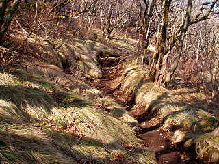 | 駒ケ岳頂上まではケーブルカーを使い そこから神山(箱根で一番高い1427m)へのぼり 尾根伝いに早雲山へと・・・がいつものコースなのですが 、今回は神山の中腹を迂回する形のコースを選んで・・・ のぼりがきつくなくていいコースでした。 途中の明るい山道。でも土の下はしっかりと霜柱・・・ 歩くたびにザクザクッと(^^) |