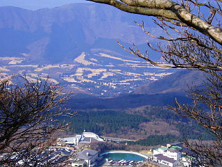 左上の富士山の下の風景。 外輪山とすそに広がるゴルフ場 下方は早雲山のふもと、 以前はスケートリンクのあった辺り |