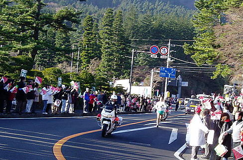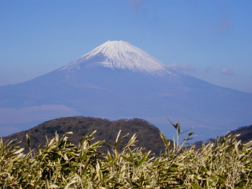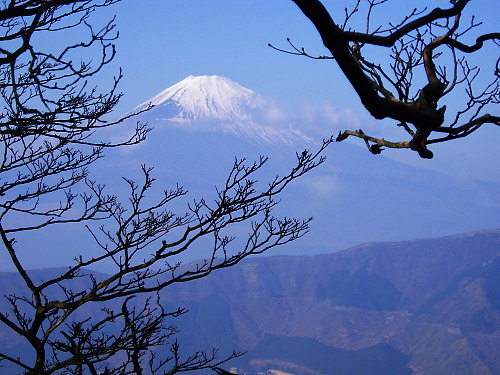 | 2004年は穏やかに暖かく明けました。 元旦からの3が日は青空にも恵まれてさわやかでした。 3日、前日から箱根で過ごしていましたので 晴天を見極めて駒ケ岳から早雲山までの山歩き。 画像は早雲山尾根道からの富士山と 箱根外輪山 |